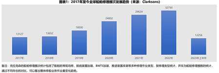 通過表1分析2017年至今船舶修理的主要數(shù)據(jù)情況可以看出,全球船舶在2023年上半年主要呈現(xiàn)以下修理特點: