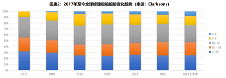 從2017年到2023年,20年及以上船齡的船舶占比由32%下降到25.7%;15-19年船齡的船舶修理由23%下降到22%;10-14年船齡船舶修理由34%下降到29%;而10年以下船齡的船舶修理占比則由10%上升到23%。隨著全球環(huán)保法規(guī)的增加,老舊船舶的淘汰將逐漸增多,修船船齡將持續(xù)呈年輕化趨勢發(fā)展。從統(tǒng)計數(shù)據(jù)來看,全球修船平均船齡已經(jīng)由2017年的17.77年下降到2023年的15.24年。